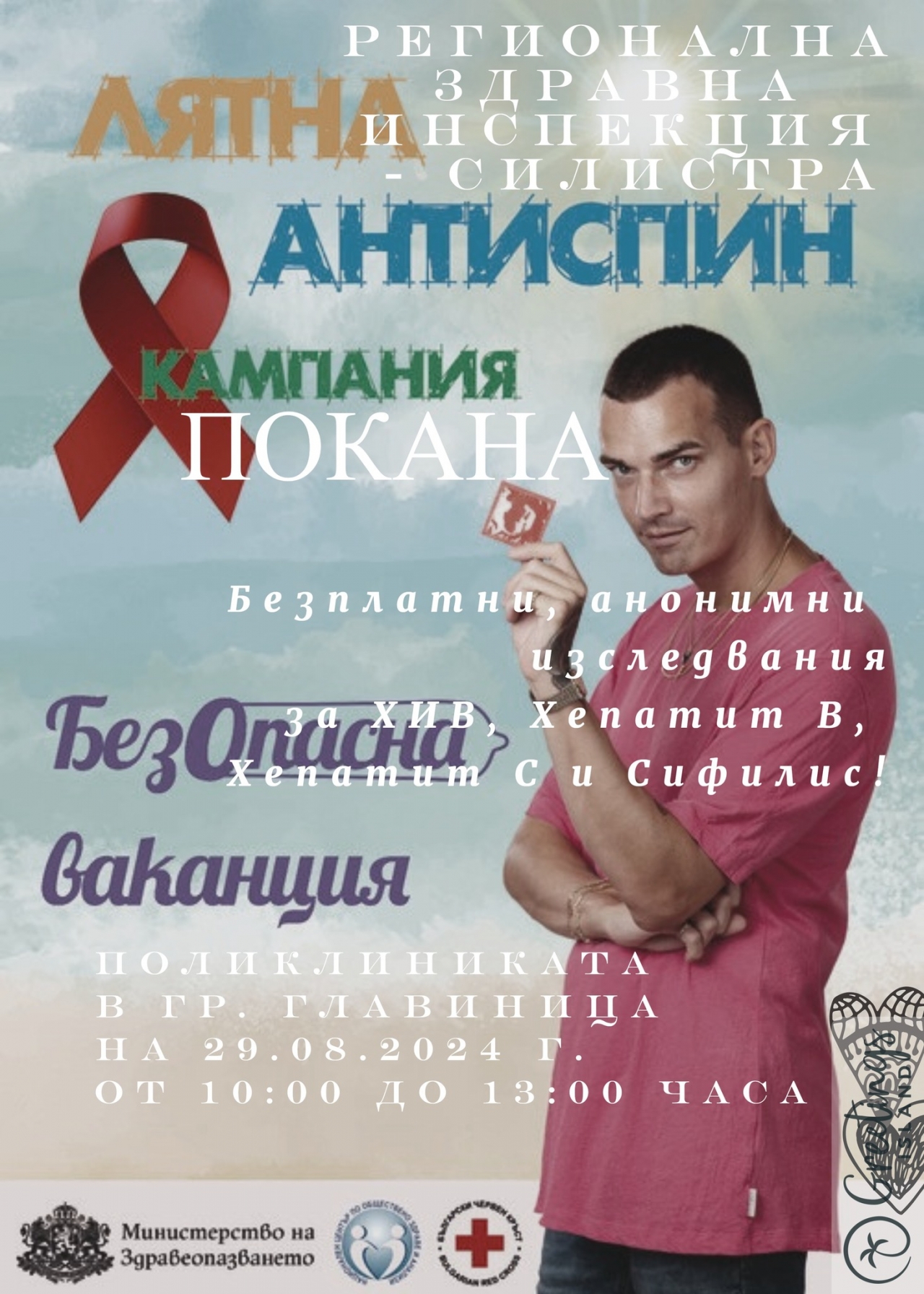Регионална здравна инспекция (РЗИ) - Силистра кани всички жители и гости на гр. Главиница да се включат в лятната АНТИСПИН кампания, която ще се проведе на 29 август 2024 г. в поликлиниката на града. В периода от 10:00 до 13:00 часа всички желаещи ще имат възможността да се възползват от безплатни и анонимни изследвания за ХИВ, хепатит В, хепатит С и сифилис.