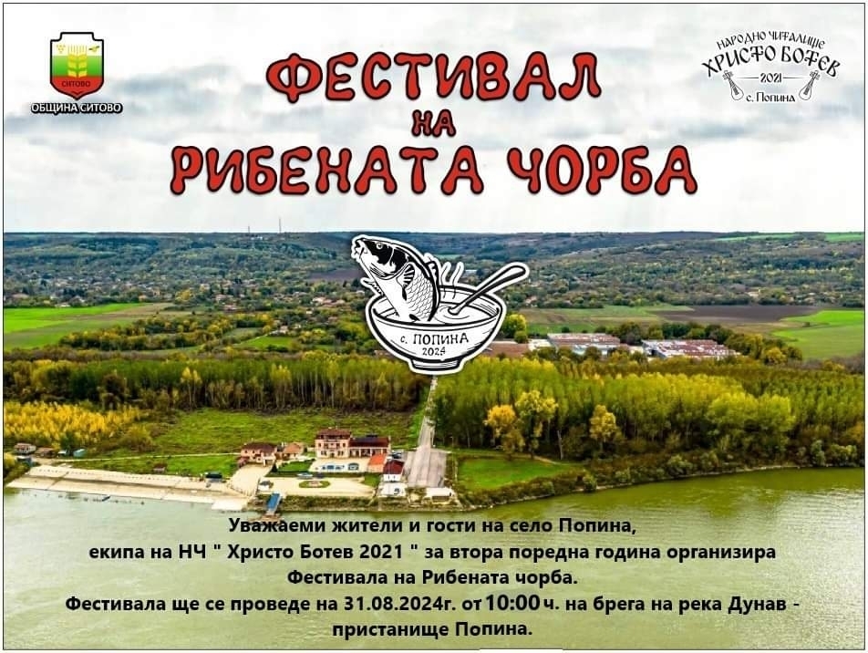 Село Попина ще бъде утре домакин на второто издание на Фестивала на рибената чорба, което ще се проведе на 31 август 2024 г. от 10:00 часа на живописния бряг на река Дунав при пристанището на селото. Събитието е организирано от Народно читалище "Христо Ботев 2021" с подкрепата на община Ситово.