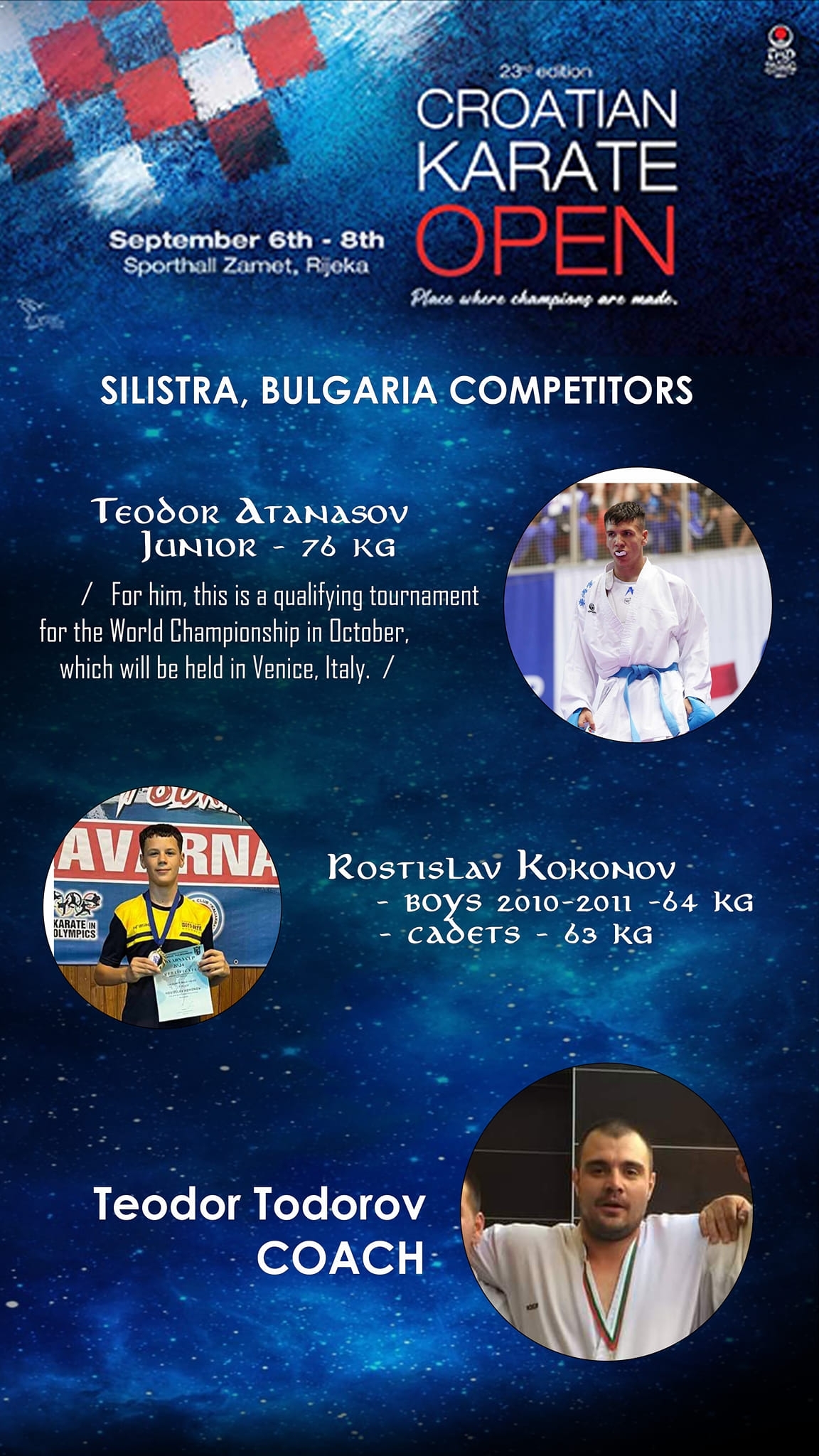 Клубът и техният треньор Теодор Тодоров пожелават успех на младите каратисти и се надяват на достойно представяне на международната сцена.