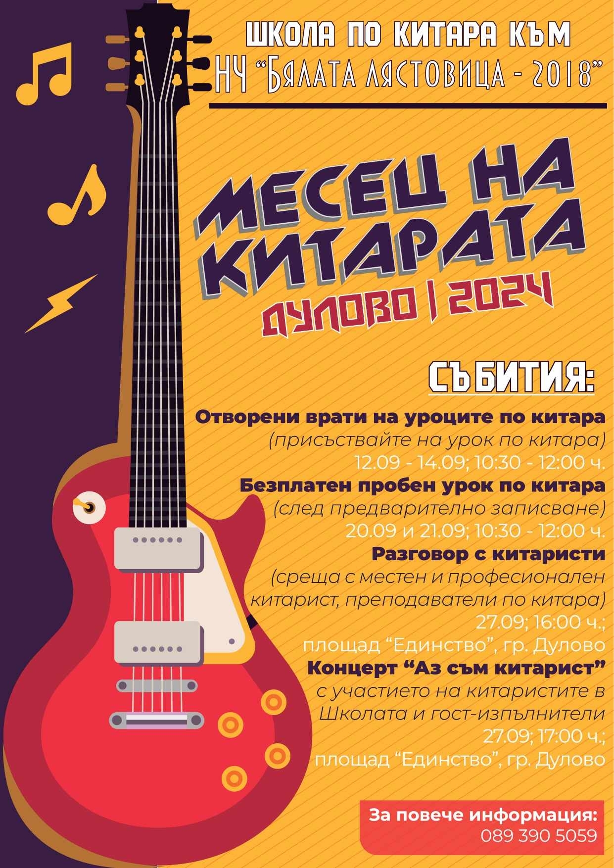 Школата по китара към НЧ "Бялата лястовица – 2018", с ръководител Светлозар Драгнев, обявява за втора поредна година Месец на китарата. Това е уникално събитие, което дава възможност на всеки да се докосне до магията на този музикален инструмент!