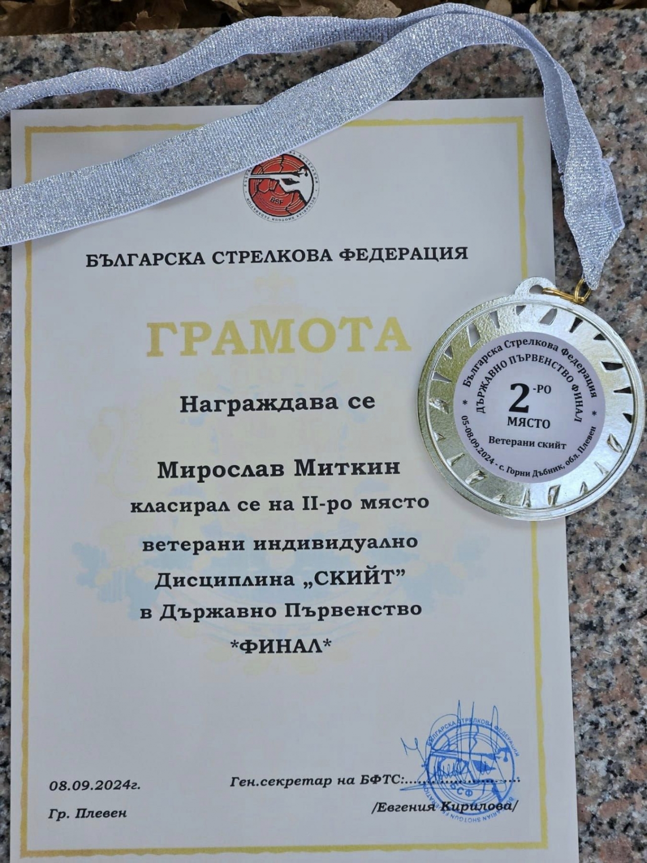 От 5 до 8 септември на стрелбищния комплекс в Горни Дъбник се проведоха финалите на държавното първенство по трап, двоен трап и скийт, организирани от Българската федерация по трап, двоен трап и скийт (БФТДТС). В категорията "Мъже ветерани" в дисциплината скийт, инж. Мирослав Миткин от ЛРД Сокол зае престижното второ място, за което бе награден с грамота и сребърен медал.