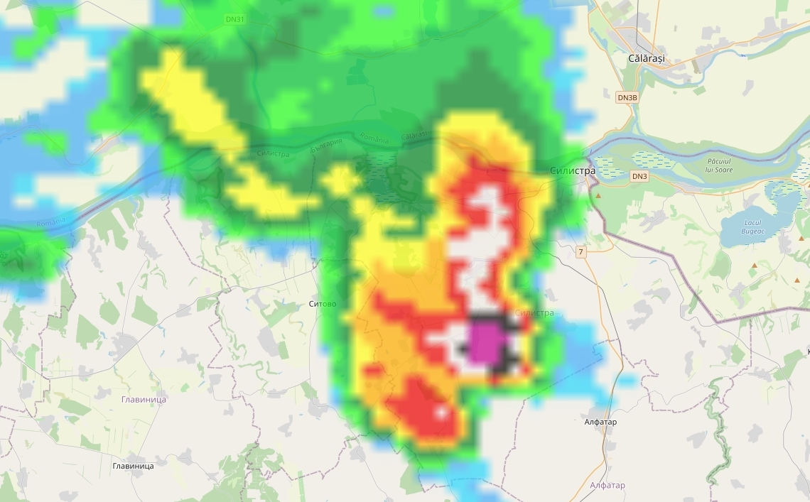 Тази вечер над Силистра преминава суперклетка, която предизвика силни гръмотевични бури и потенциално опасни метеорологични явления. Според метеорологичната карта, показваща движението на бурята, районът е подложен на интензивни валежи и силни ветрове, като е възможно да се наблюдават и градушки.