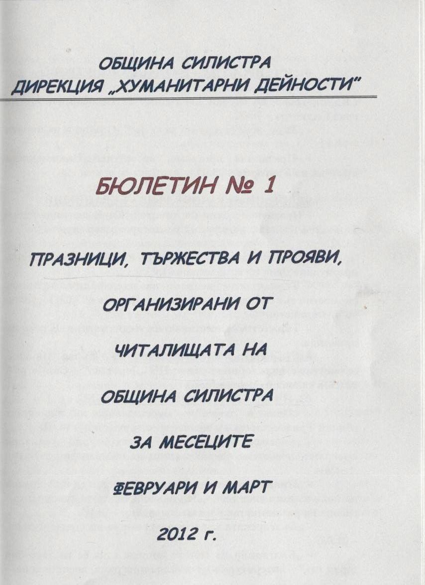 Излезе брой 1 на информационен бюлетин за празници, тържества и прояви, организирани от читалищата на територията на Силистренската община. Инициативата е на дирекция "Хуманитарни дейности" и на читалищните дейци, а съставител е общинският отдел "Култура".