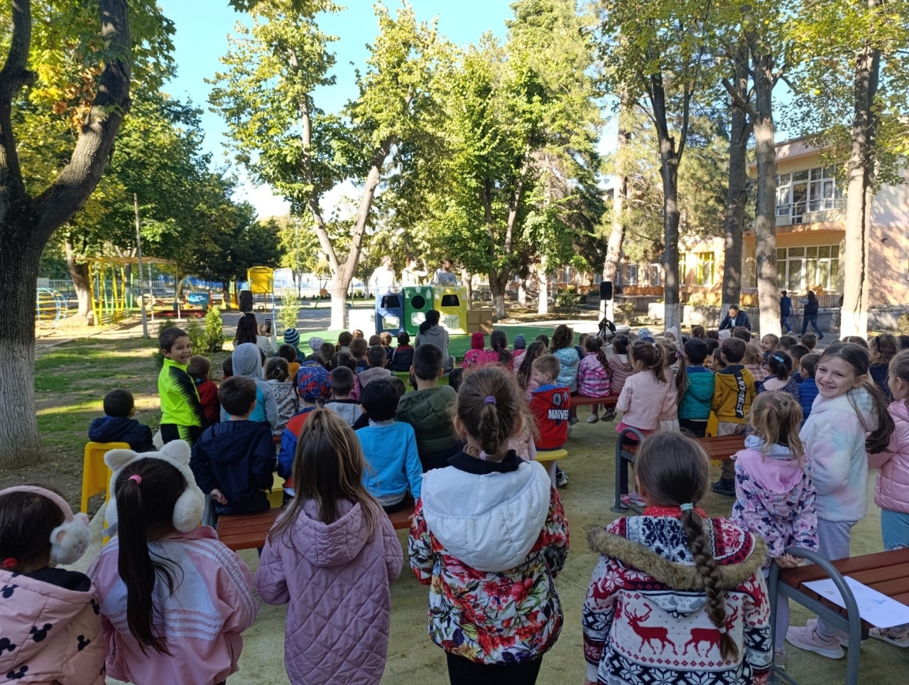 Постановката, озаглавена "ЕКО ПРИКЛЮЧЕНИЯ", поднесе важни послания за опазването на околната среда по забавен и интерактивен начин. Децата научиха за значението на цветните контейнери за разделно събиране на отпадъци, какво е рециклиране и защо е важно да се грижим за природата и за собствената си чистота.