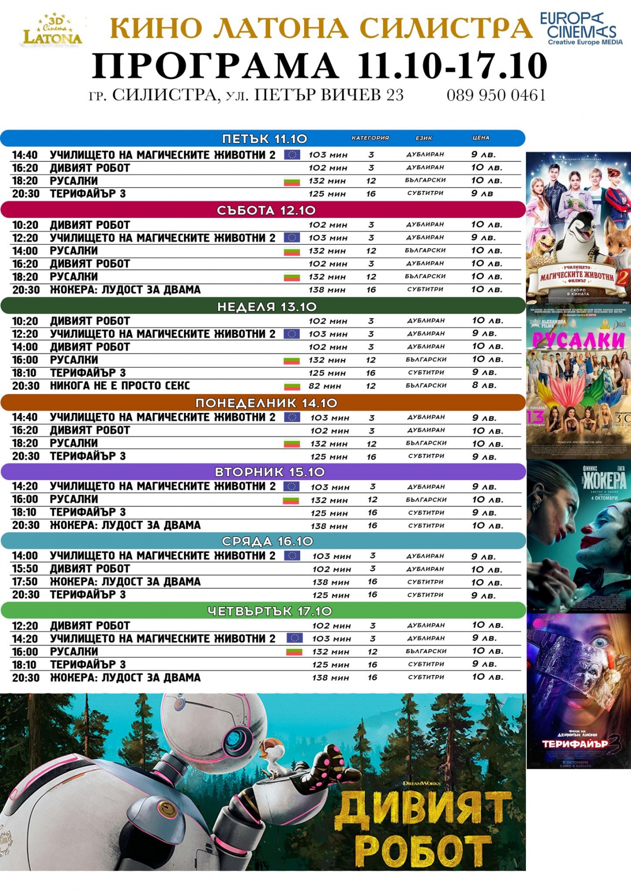 Latona Cinema - Силистра обяви новата си програма, включваща разнообразие от популярни филмови заглавия, които ще зарадват зрителите от всички възрасти. Сред акцентите са дългоочакваните филми като "РУСАЛКИ" и "ЖОКЕРА: ЛУДОСТ ЗА ДВАМА", които предлагат емоционални и завладяващи истории. За любителите на трилърите, киното предлага "ТЕРИФАЙЪР 3", обещаващ напрежение и неочаквани обрати.