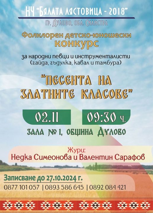 Народно читалище "Бялата лястовица – 2018" с гордост обявява първото издание на Фолклорния детско-юношески конкурс "Песента на златните класове" за певци и инструменталисти, който ще се проведе в град Дулово. Събитието има за цел да събере млади таланти, изпълняващи български народни песни и народни инструменти, и да утвърди града като център на фолклорната култура и музикалния обмен.