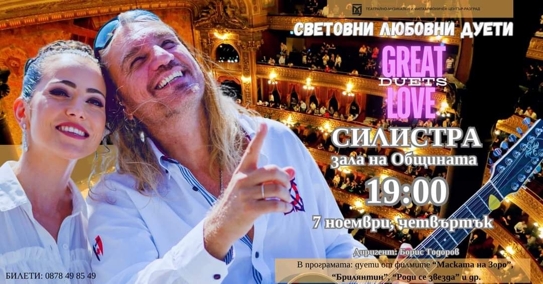 На 7 ноември 2024 г. от 19:00 часа в залата на Община Силистра ще се проведе вълнуващ музикален концерт под надслов "Световни любовни дуети". Събитието ще бъде представено от оркестъра на Разградска филхармония "Проф. Д. Ненов" под диригентството на маестро Борис Тодоров.