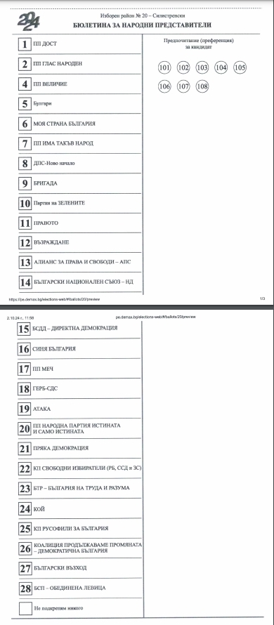 В 20-и изборен район бюлетината за предстоящите избори ще бъде на две страници, съобщиха от Районната избирателна комисия (РИК) – Силистра. В района да няма регистрирани максимален брой кандидатски листи и независими кандидати, затова бюлетината е разделена само на две части поради изискванията за по-голяма яснота и леснота на гласуване.