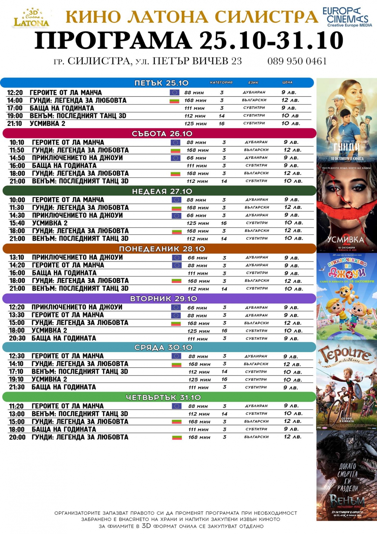Latona Cinema в Силистра продължава да радва любителите на киното с нови прожекции и вълнуващи премиери. От 25 октомври зрителите ще имат още възможности да се насладят на нашумелия филм "ГУНДИ: ЛЕГЕНДА ЗА ЛЮБОВТА", който продължава да събира възторжени отзиви.