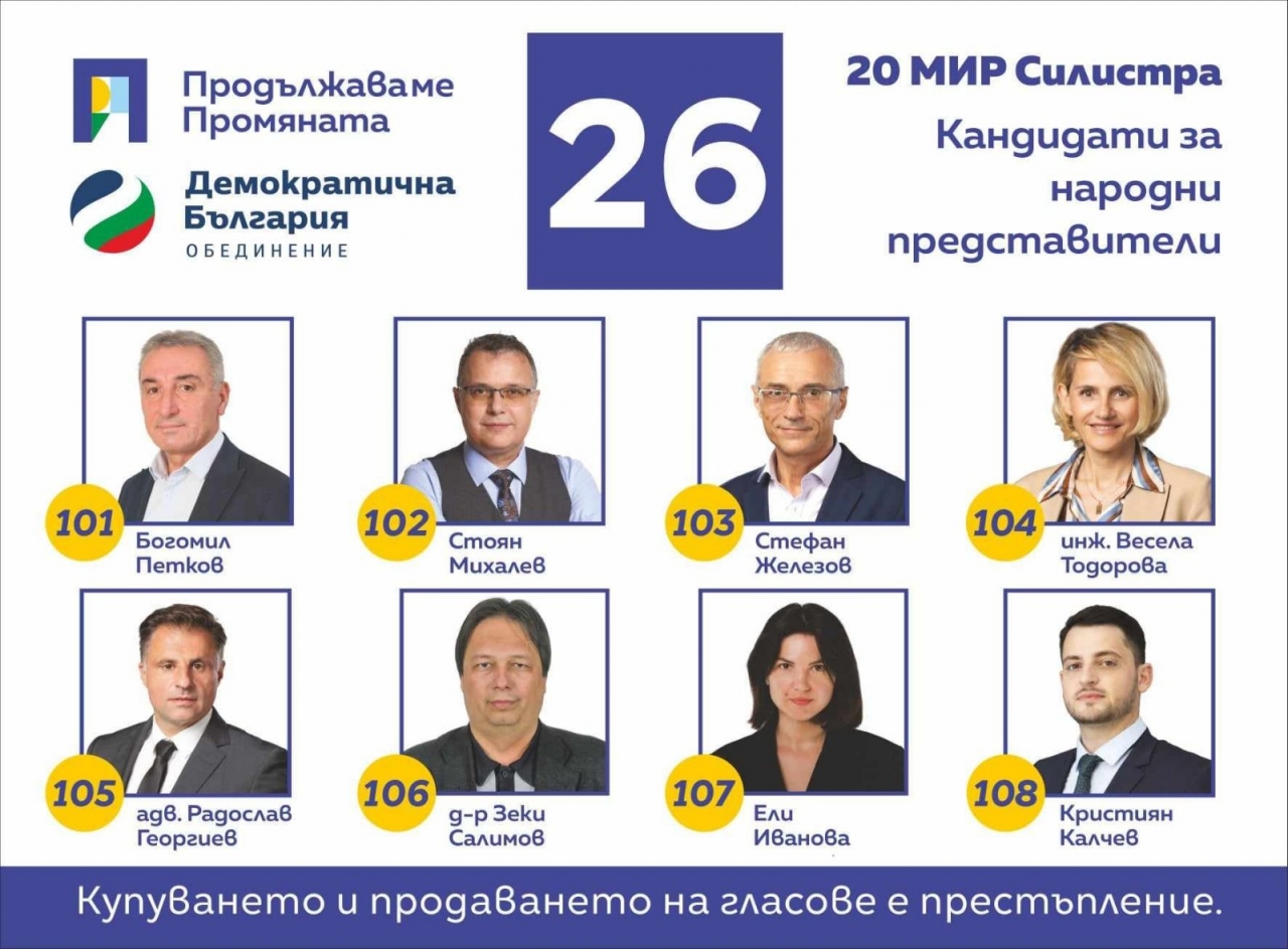 Богомил Петков, Стоян Михалев, Стефан Железов, инж. Весела Тодорова, адв. Радослав Георгиев, д-р Зеки Салимов, Ели Иванова, Кристиян Калчев – един отбор, който е готов да работи за промяната с ясното разбиране, че най-важният капитал на България са хората, а не корупционните проекти. И с основната ни цел – щастливи граждани в подредена и правова държава.