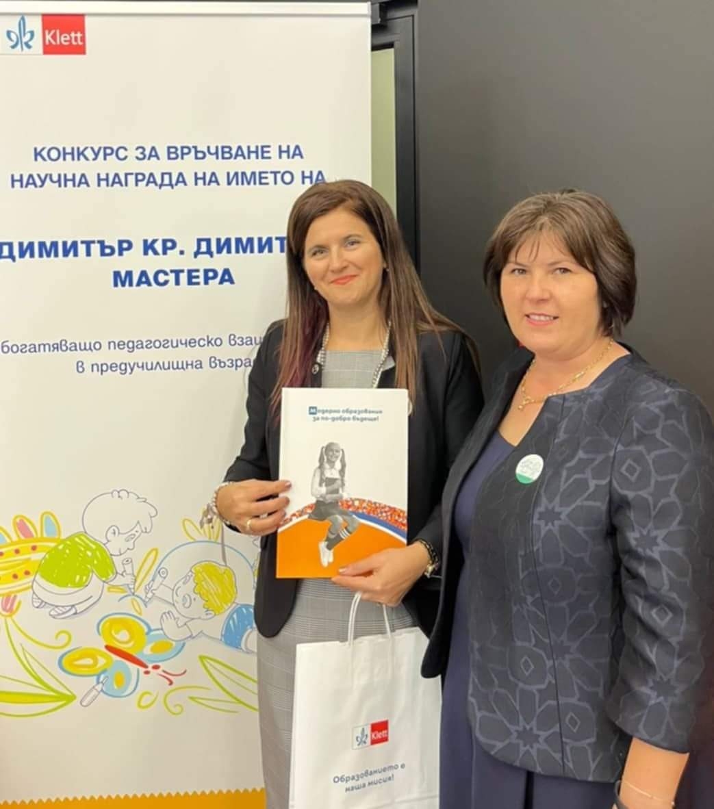 На националния научен конкурс "Обогатяващо педагогическо взаимодействие в предучилищна възраст," организиран от издателство КЛЕТ и посветен на Димитър Димитров-Мастера, тя завоюва второ място в категория "Индивидуален проект".