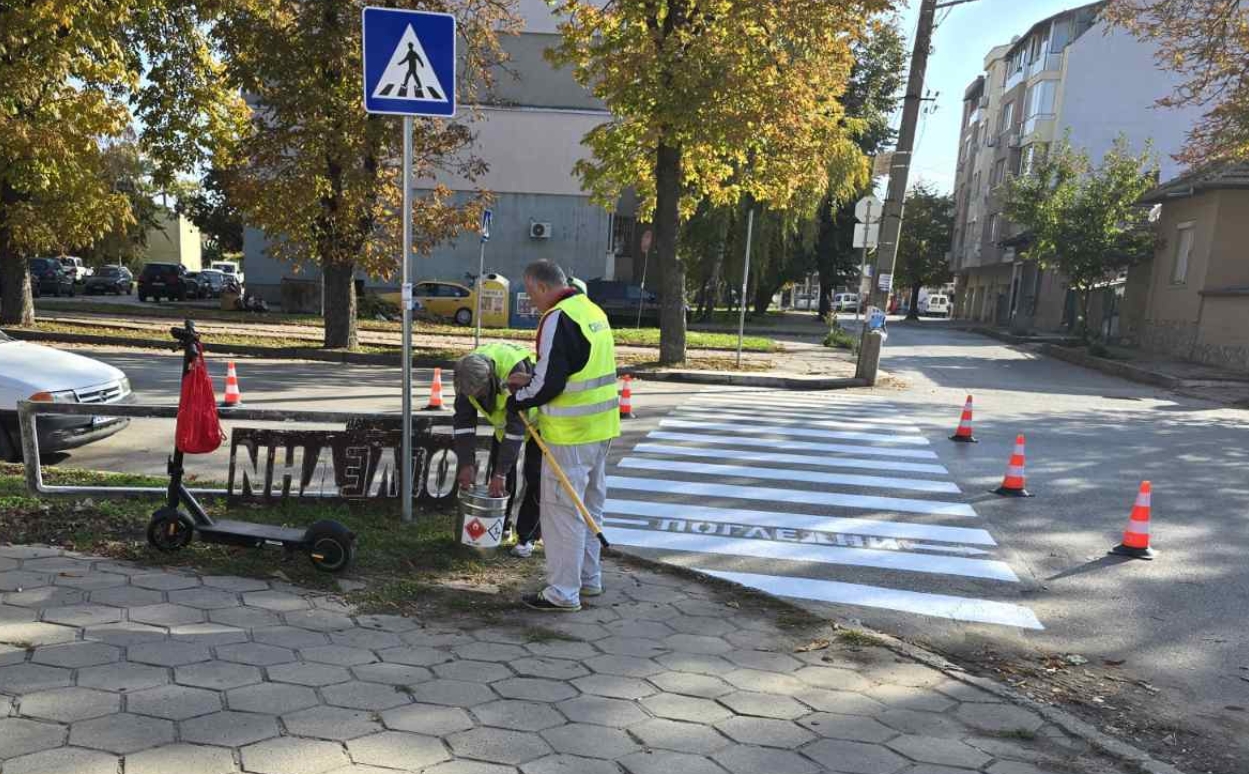 Общинско предприятие "Дръстър" започна възстановителни дейности по пътната маркировка на кръстовището на бул. "Македония" и ул. "Добрич", известно като "Старата автогара".