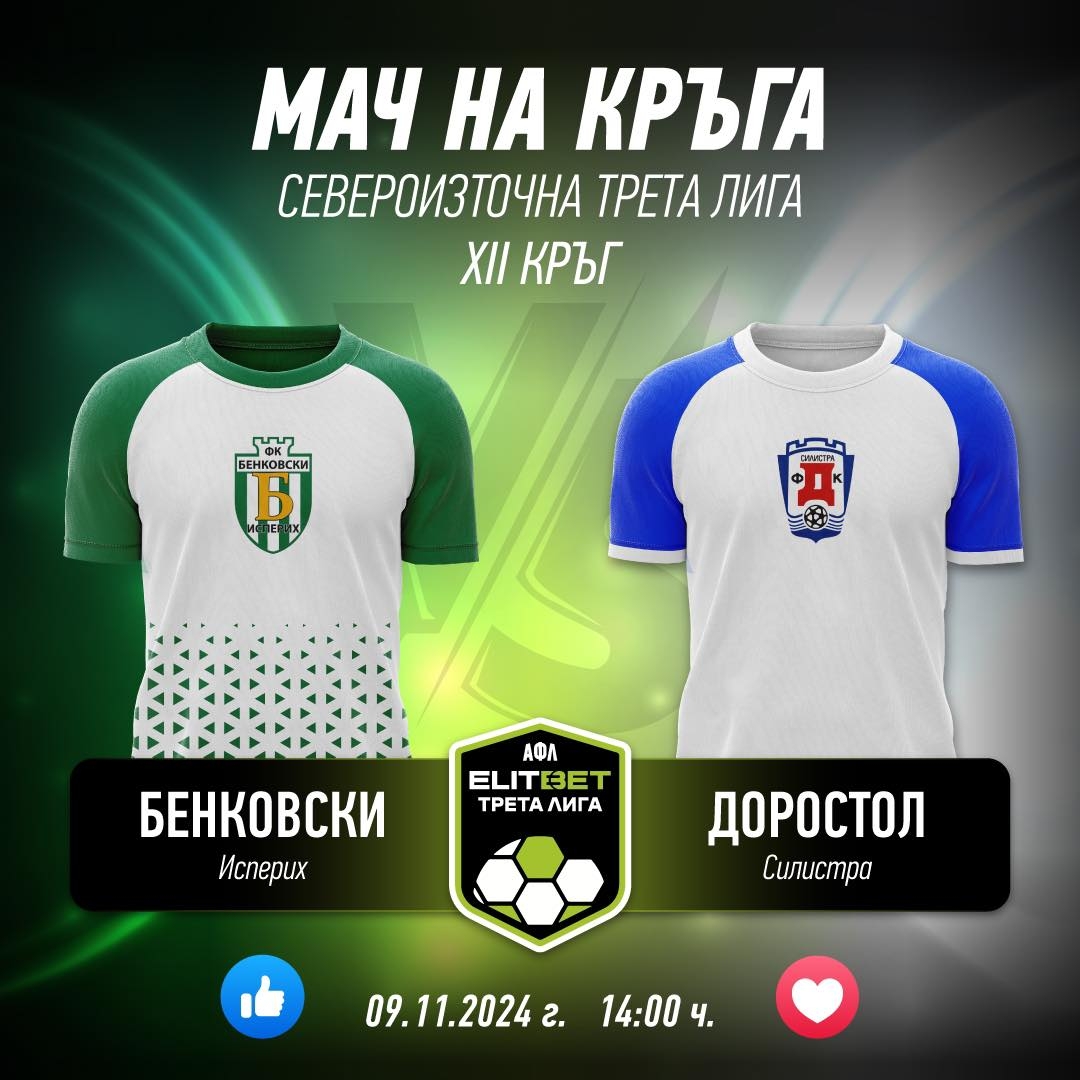 Днес, Бенковски (Исперих) ще се изправи срещу Доростол (Силистра) в среща от 12-ия кръг на Североизточната ELITBET Трета лига. Поради ремонт на стадиона в Исперих, мачът ще се състои в село Браничево. Под въпрос за домакините са участието на ключовите играчи Теодор Иванов и Ивелин Василев.