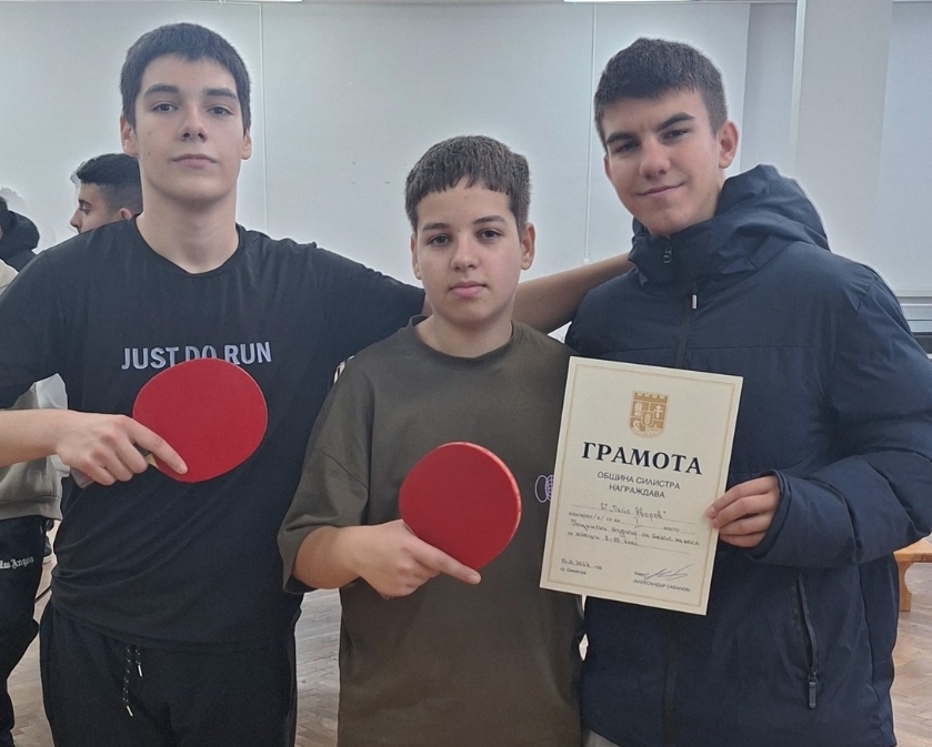 Учениците от 8-10 клас на Езикова гимназия "Пейо Яворов" - гр. Силистра, постигна пореден успех в тениса на масата, спечелвайки шампионската титла на град Силистра в първия етап на ученическите игри за учебната 2024/2025 година. Отборът, включващ Максим Стамбов от 10а клас, Теодор Ангелов и Дани Илиев от 9в клас, демонстрира превъзходство и отборен дух, като победи шест силни отбора.