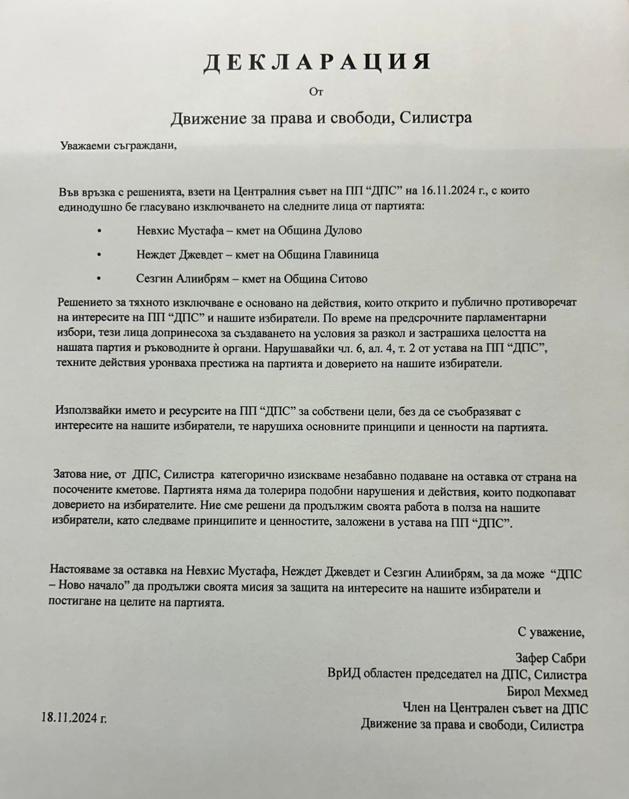 Движението за права и свободи - Ново начало в Силистра поиска оставките на трима кметове от областта след взето решение на Централния съвет на партията на 16 ноември 2024 г. В специална декларация, подписана от временно изпълняващия длъжността областен председател на ДПС, Зафер Сабри, и общинския председател на партията в община Силистра, Бирол Мехмед, бе оповестено, че кметовете на Дулово, Главиница и Ситово са изключени от редиците на партията.