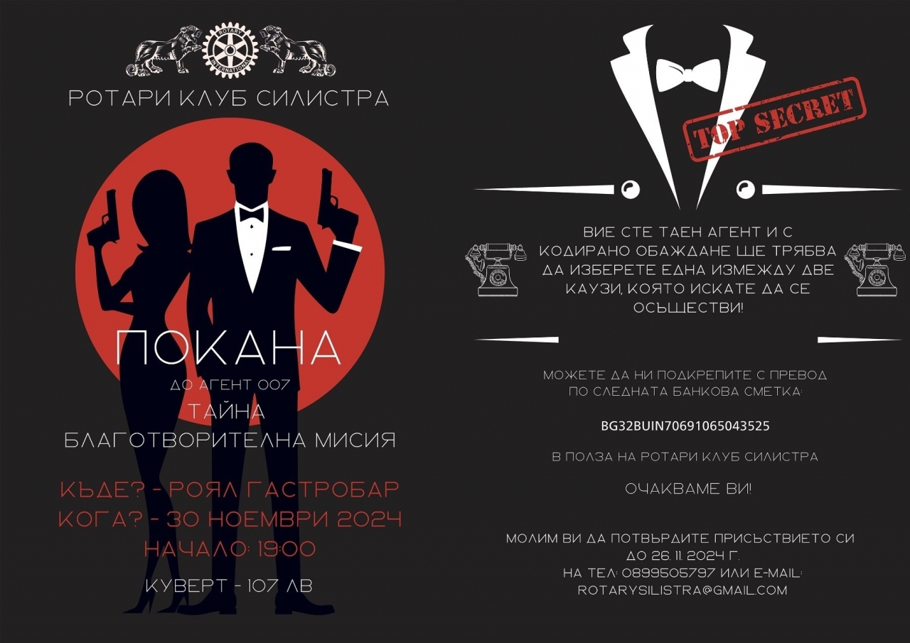 Ротари клуб Силистра отправя специална покана за всички желаещи да се включат в тайна благотворителна мисия под надслов "Агент 007". Събитието ще се проведе на 30 ноември 2024 г. (събота) от 19:00 часа в Роял Гастробар, като кувертът е на стойност 107 лева.