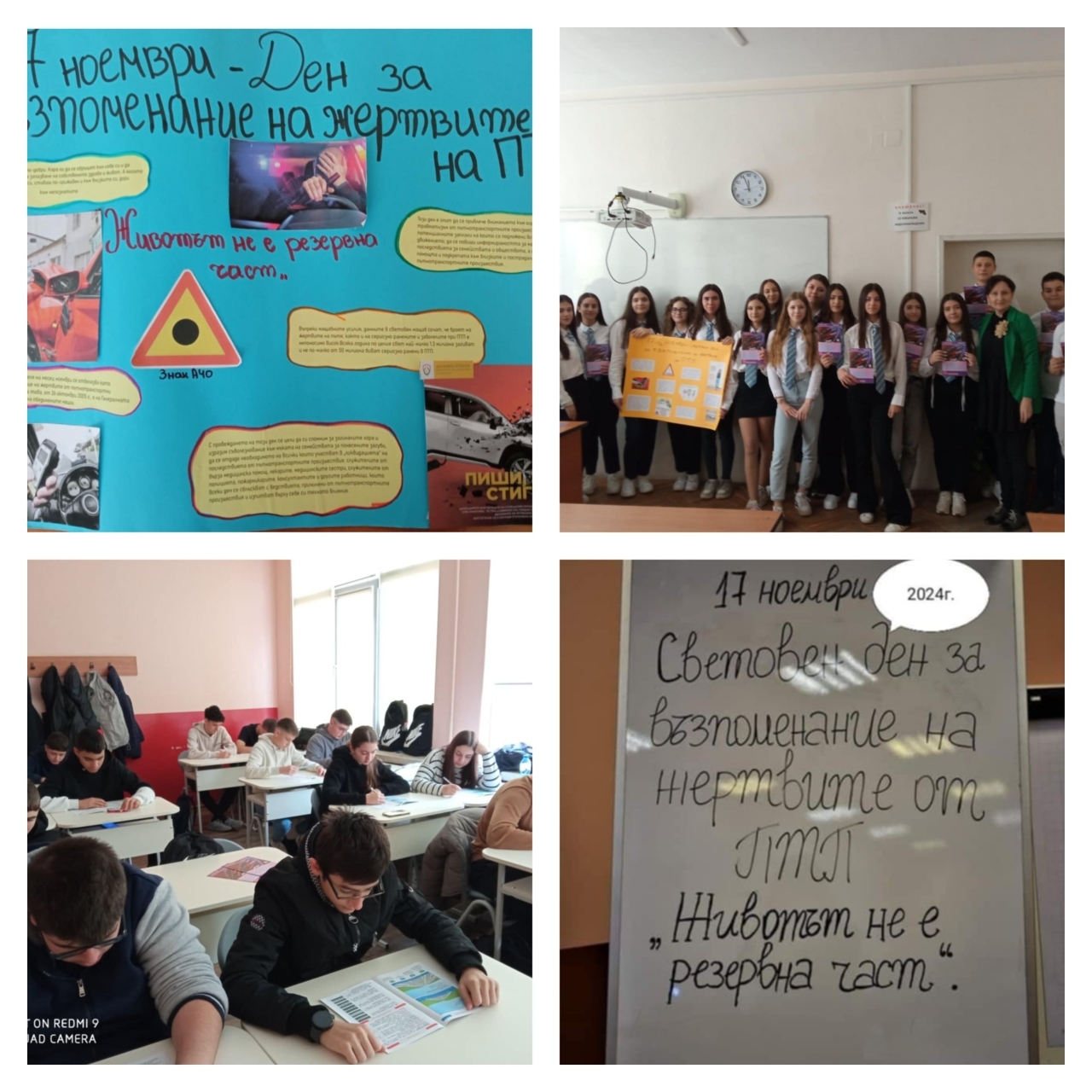 Екип ученици от 12.а клас, включващ Дияна Живкова и Жулиета Андреева, изготви вдъхновяващи постери, сред които посланието "Животът не е резервна част", което привлече вниманието на учениците. Освен това, дванадесетокласниците представиха презентация пред съучениците си от 9.а клас по време на часа по безопасност на движението по пътищата (БДП). Вниманието бе насочено към личната отговорност на всеки участник в движението и значението на спазването на правилата за безопасност.