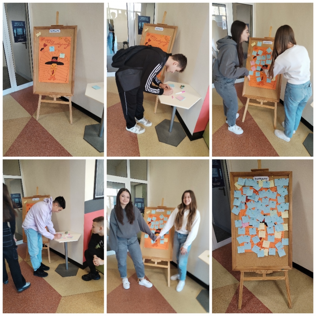 На видно място в гимназията учениците от 10.Б клас поставиха цветен постер с надпис "БЛАГОДАРЯ!". До него бяха оставени бележки, върху които всеки можеше да напише за какво е благодарен – от приятели и семейство до малки радости като красив сутрин или вкусен обяд.