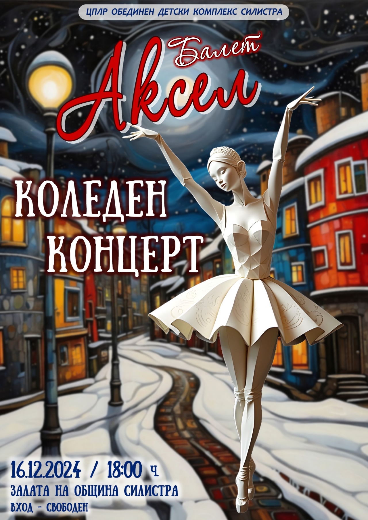 С ежегодния си Коледен концерт Балет "Аксел" към ЦПЛР ОДК - Силистра отправя празничен поздрав към своите приятели и почитатели. По случай предстоящите коледно-новогодишни празници, възпитаниците на школата по модерен балет, заедно с още от талантливите деца на Силистра, ще подарят на зрителите една прекрасна вечер. Заповядайте на 16 декември 2024 г. (понеделник) в залата на Община Силистра от 18:00 часа, вход - свободен.