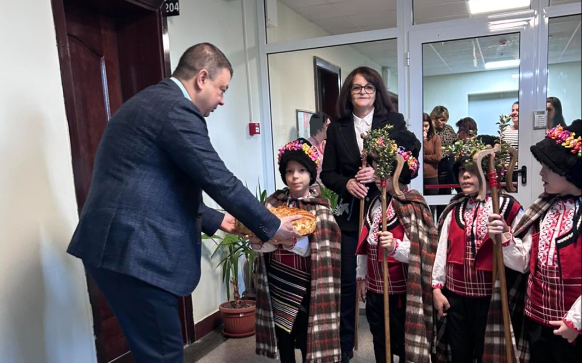 Първи гости днес бяха малките коледари от ДГ "Ян Бибиян", които със своите песни и благословии отправиха пожелания за здраве и успехи към кмета и служителите в общинската администрация.
