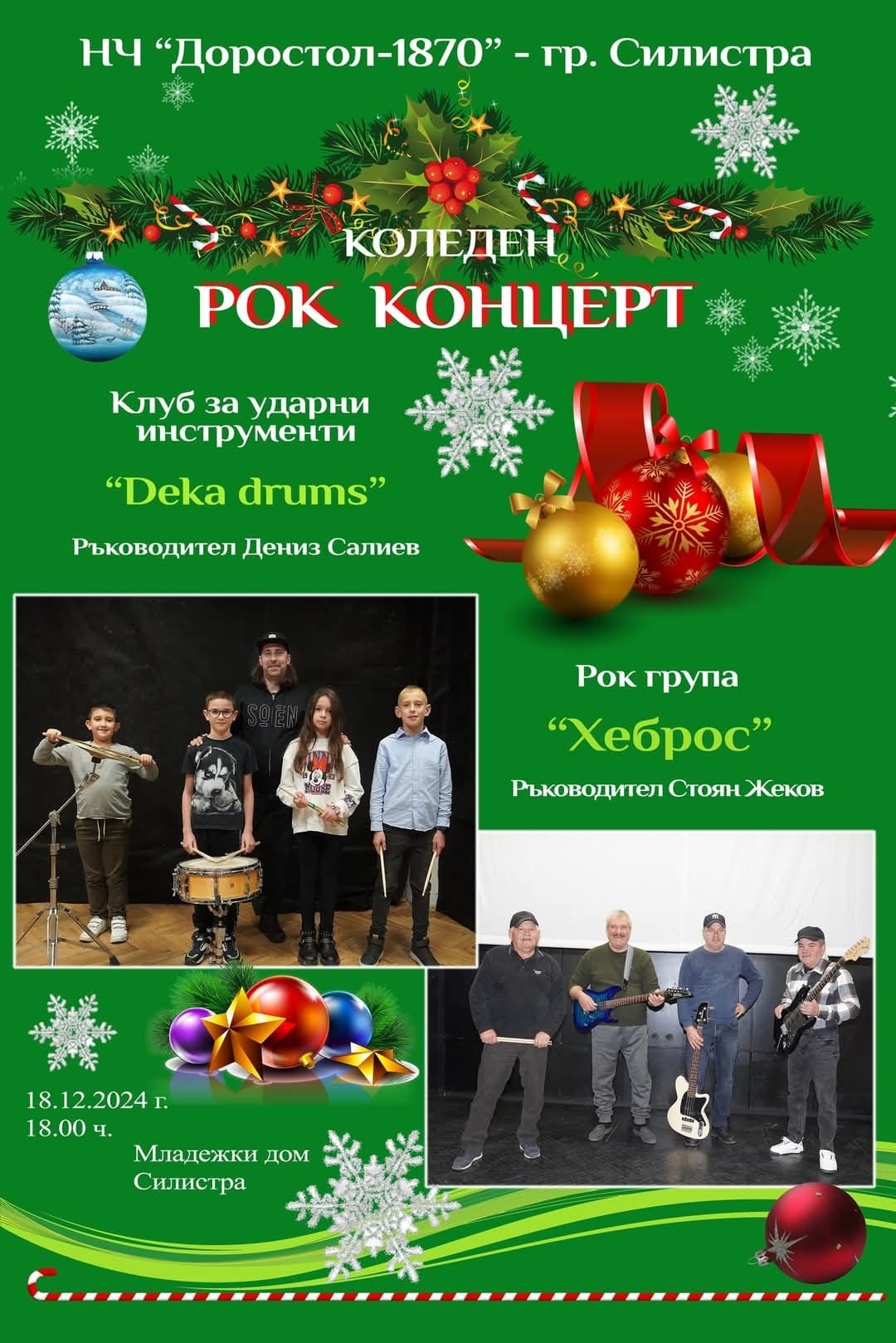 На 18 декември 2024 г. от 18:00ч. в Младежкия дом в Силистра ще се състои Коледен рок концерт , организиран от НЧ "Доростол-1870" – гр. Силистра.