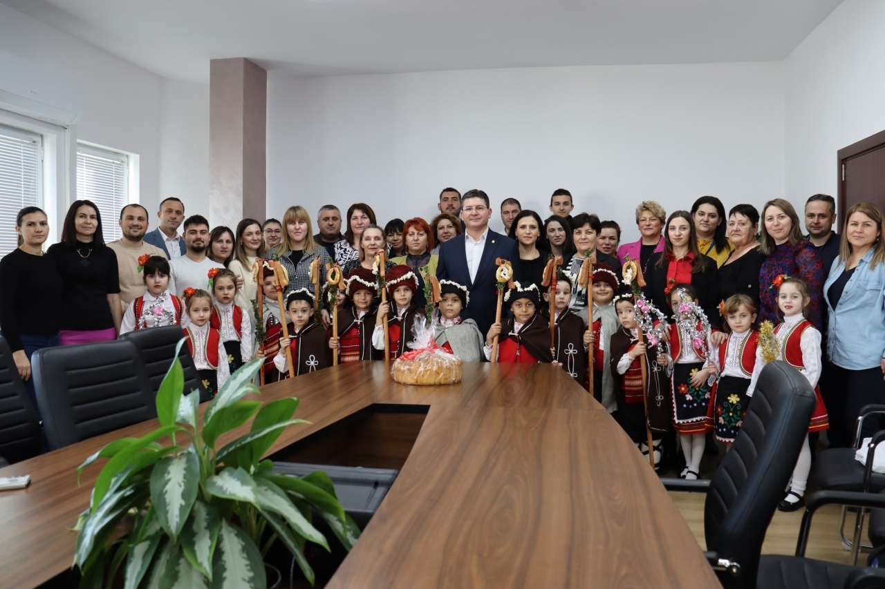 Облечени в традиционни празнични носии, с калпаци, украсени със специални китки, и геги в ръце, децата изпълниха заседателната зала с коледни наричания и пожелания за здраве, берекет и успешна Нова година. Техните усмивки и артистичност внесоха радост и настроение в администрацията.