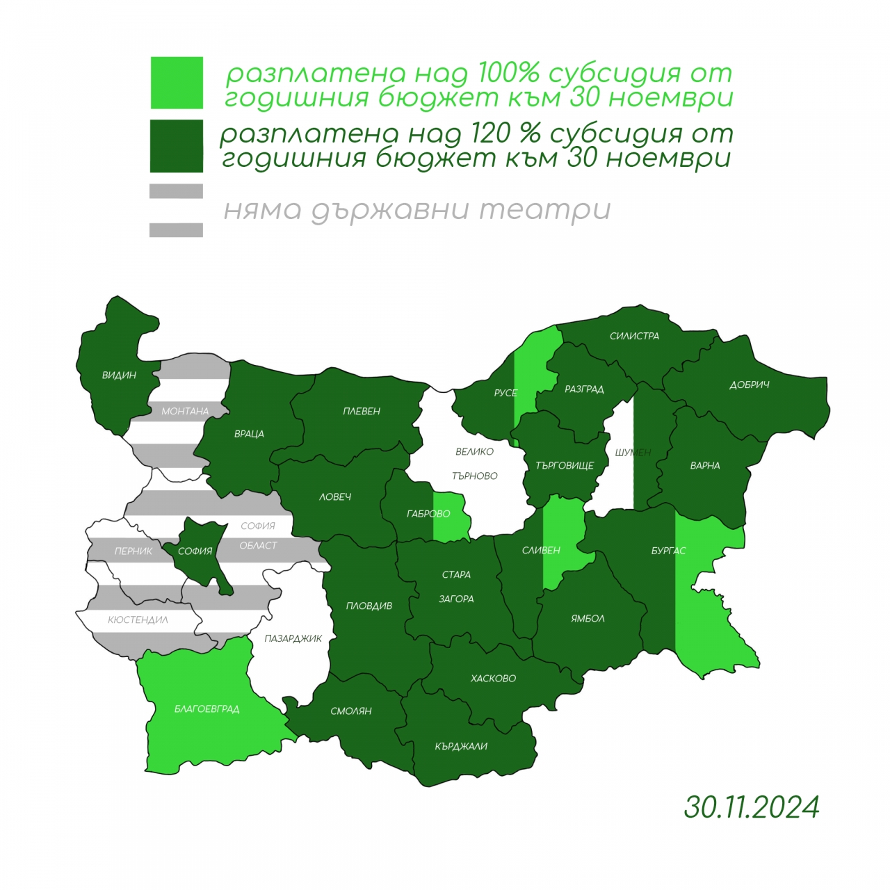 Приходите на сценичните изкуства за 2024 г. значително надвишават тези от предходни години, което е доказателство за успешната работа на театрите, въпреки ограниченията.
