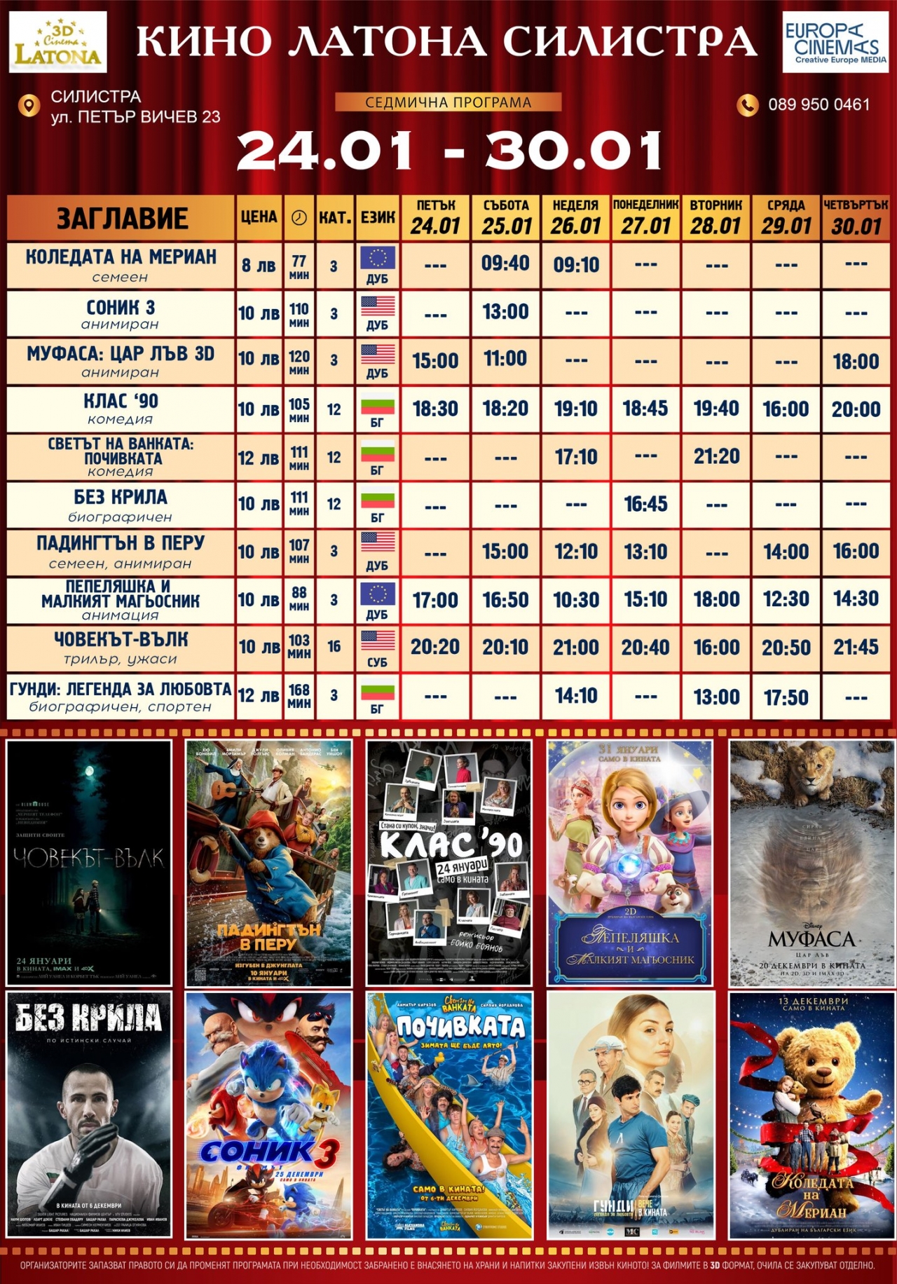 Програмата предлага филми за всяка възраст и интереси, като прожекциите се провеждат всеки ден от сутринта до вечерта. Не пропускайте възможността да се насладите на най-доброто от киното в уютната атмосфера на Кино Латона.