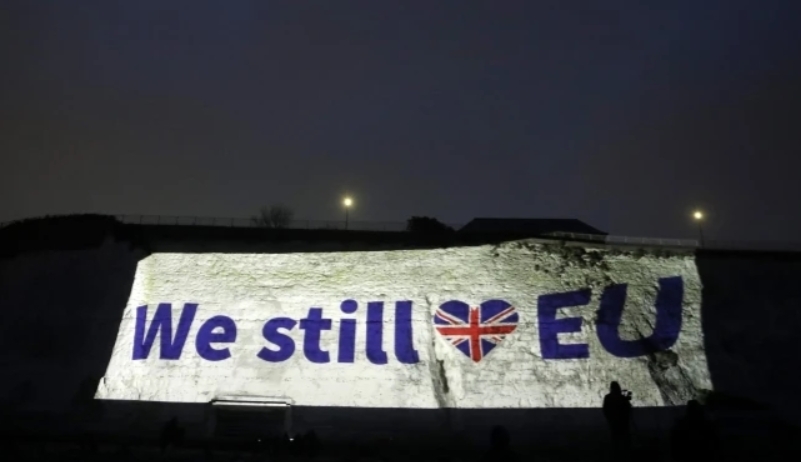 Снимка: Проекция се появява на скала в Рамсгейт, Южна Англия, петък, 31 януари 2020 г. (AP Photo/Matt Dunham, File)