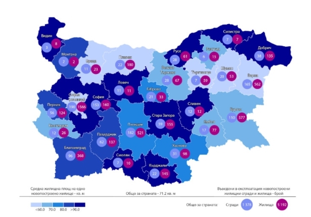 Общо 1 378 нови жилищни сгради са въведени в експлоатация в България през последните три месеца на 2024 г., което представлява увеличение от 17% спрямо предходното тримесечие. Броят на новите жилища е 5 192, като най-много от тях са регистрирани в София (1 566), Варна (562) и Пловдив (521).