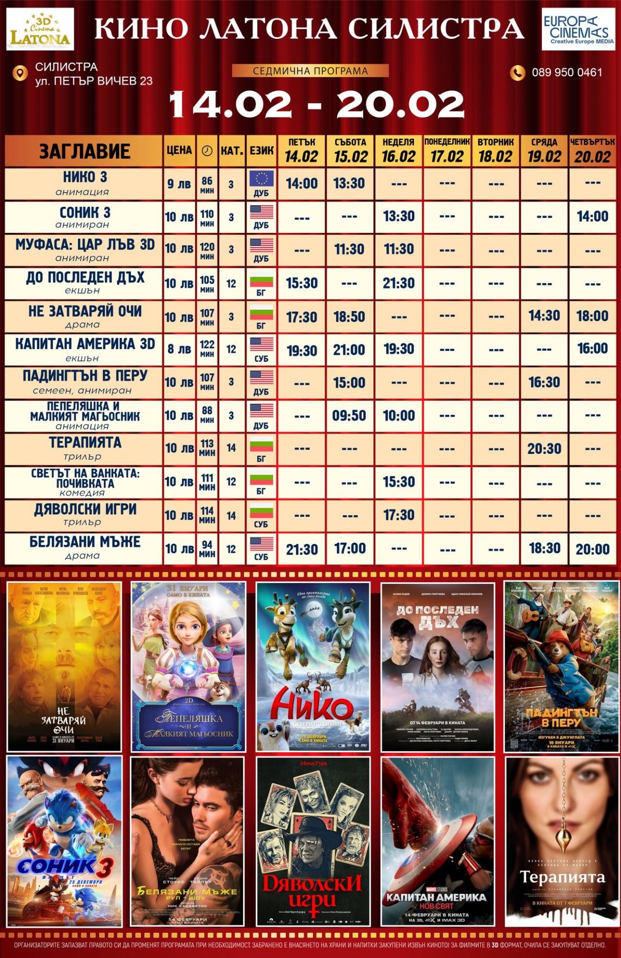 Кино Латона Силистра предлага на зрителите вълнуваща седмица, изпълнена с разнообразни филмови заглавия, които ще задоволят всякакви вкусове. В периода 14-20 февруари зрителите ще могат да се насладят на най-новите анимации, екшъни, драми и трилъри, сред които "Дяволски игри" , "Соник 3" , "Муфаса: Цар Лъв 3D" , "Не затваряй очи" , "Светът на Ванката: Почивката" , "Падингтън в Перу" , "Терапията" и други.