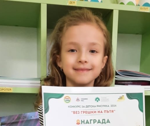 Признанието за нейния талант идва под формата на грамота и специална награда – ваучер на стойност 100 лева от книжарница. Конкурсът, посветен на безопасността на пътя, подчертава децата да изразят чрез изкуство своето виждане за правилата и отговорността в движението.