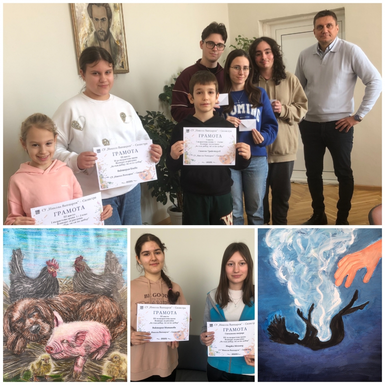 Средно училище "Никола Й. Вапцаров" обяви резултатите от общинския конкурс за рисунка "Аз съм добър, ти си по-добър", организиран по проект "Училище без агресия за сигурна образователна среда". Конкурсът събра множество талантливи участници от различни училища в Силистра и региона, като акцентът бе поставен върху теми, свързани с добротата, толерантността и съпричастността.