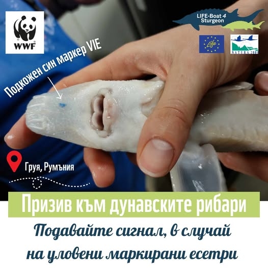 ✅ При улов на маркирани есетри, сигнализирайте WWF България и освободете рибите обратно във водата – независимо дали са диви или от зарибявания.