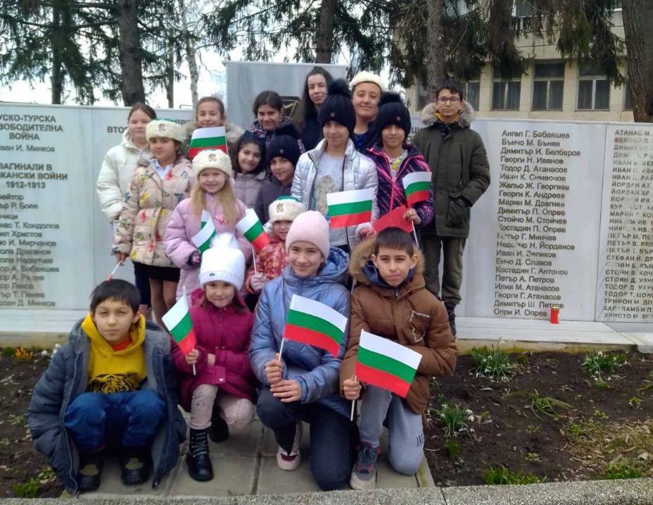 Учениците се включват в рецитал и тържествено поднасяне на цветя пред Паметника на загиналите и участниците във войните , отдавайки заслужена почит към борците за национална независимост.