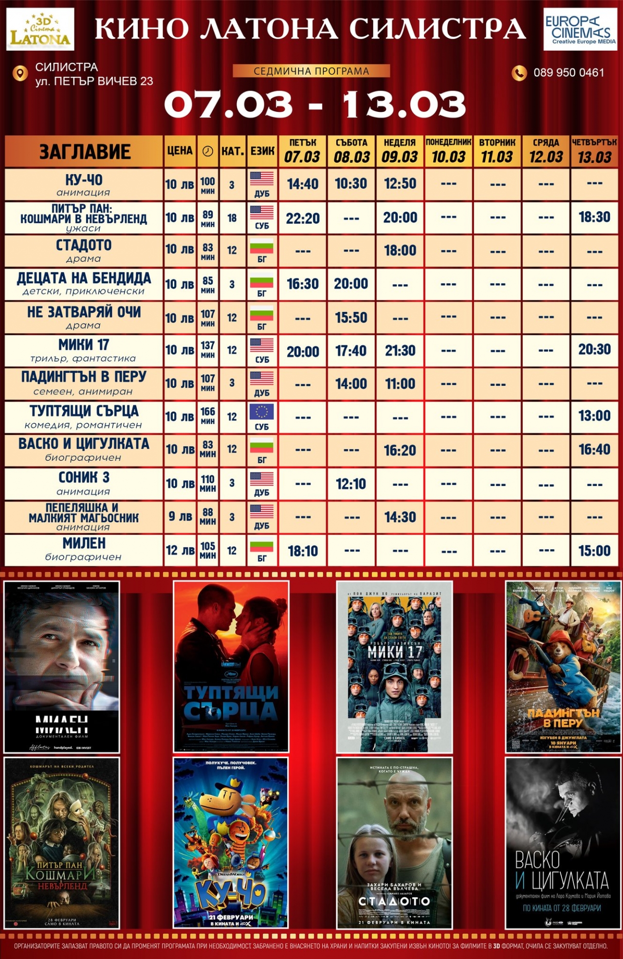 Кино Latona Cinema – Силистра предлага разнообразна и вълнуваща филмова програма за периода 7-13 март. Сред акцентите е премиерният фантастичен трилър "МИКИ 17", с участието на Робърт Патинсън, който ще бъде излъчван от 7 март (петък). Филмът ще има прожекции в петък, събота, вторник и четвъртък, като се очаква с голям интерес от любителите на жанра.