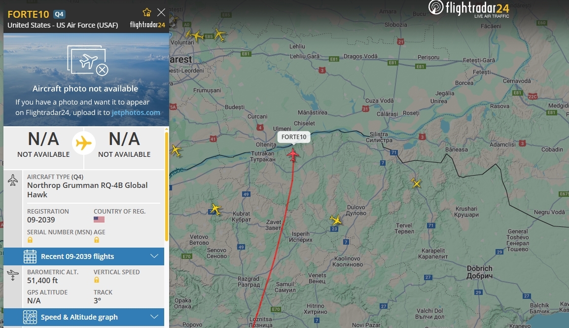 Разузнавателен безпилотен летателен апарат на американските военновъздушни сили – Northrop Grumman RQ-4B Global Hawk, бе забелязан да лети над област Силистра малко след 8:00 часа тази сутрин, сочат данни от платформата Flightradar24. Дронът е летял на височина от около 15 600 метра в близост до границата с Румъния, като част от мисия над Източна Европа.
