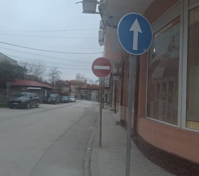 На улица "Генерал Скобелев" в град Силистра е засечен абсурден пътен казус – два противоречащи си знака, които създават риск от объркване на шофьорите. Един до един са поставени знаците "Задължителна посока – направо" (син кръг със стрелка) и знак "Забранено влизането" (червен кръг с бяла черта), което води до правен и логически абсурд.