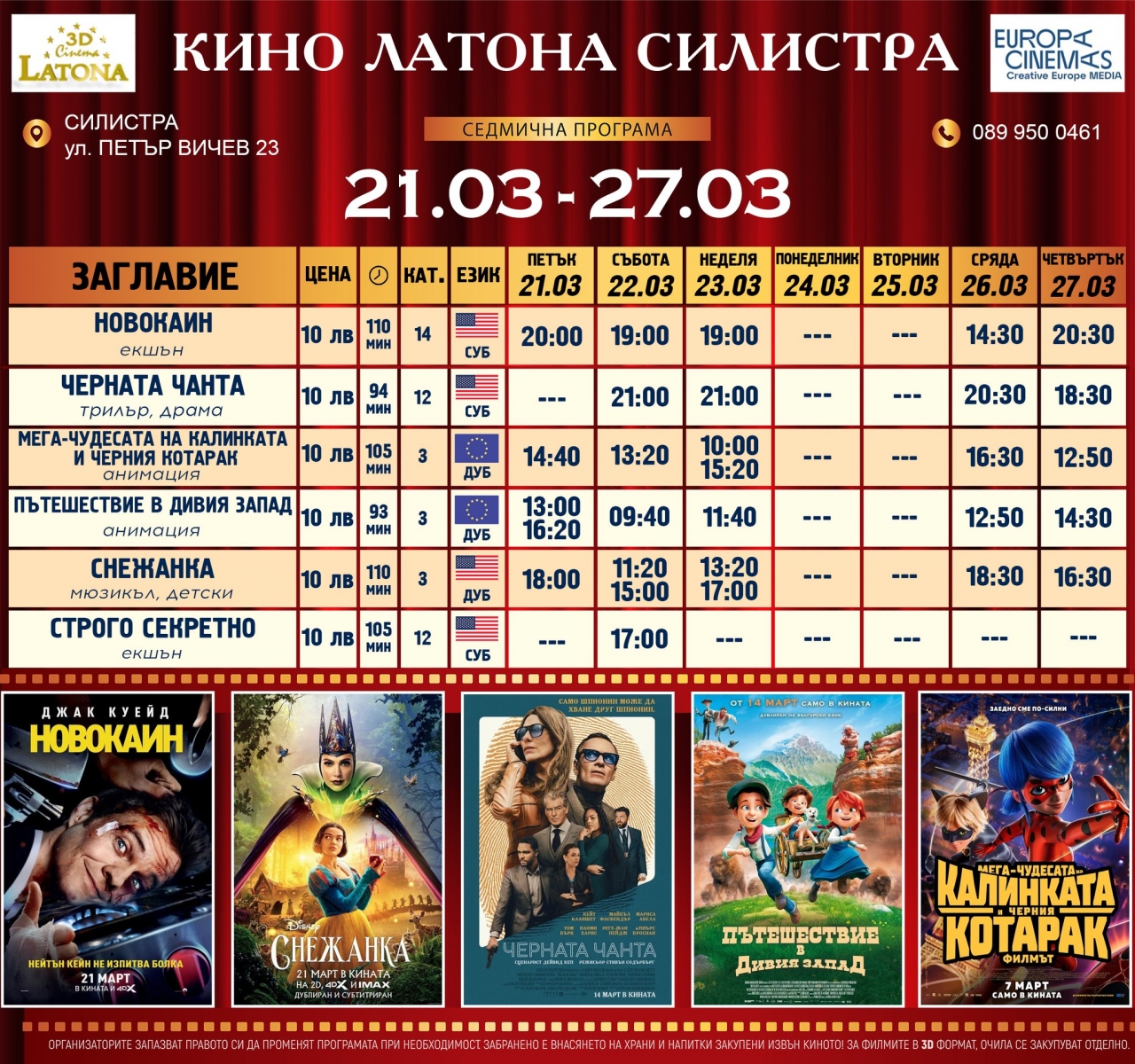 Кино Латона Силистра представя седмичната си програма от 21 до 27 март
