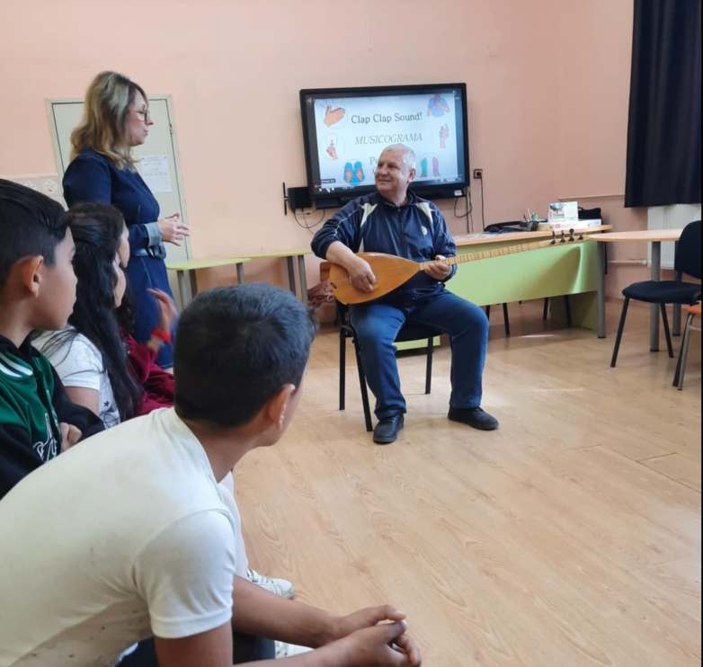 Специален гост на класа и ресурсната група бе чичо Дорхан – част от непедагогическия персонал в училището, но също така и майстор-самоук на любимия си музикален инструмент – саз. С неподправена емоция той представи на учениците историята на този древен струнен инструмент, разказа за неговия произход и как се различава от други популярни струнни инструменти.