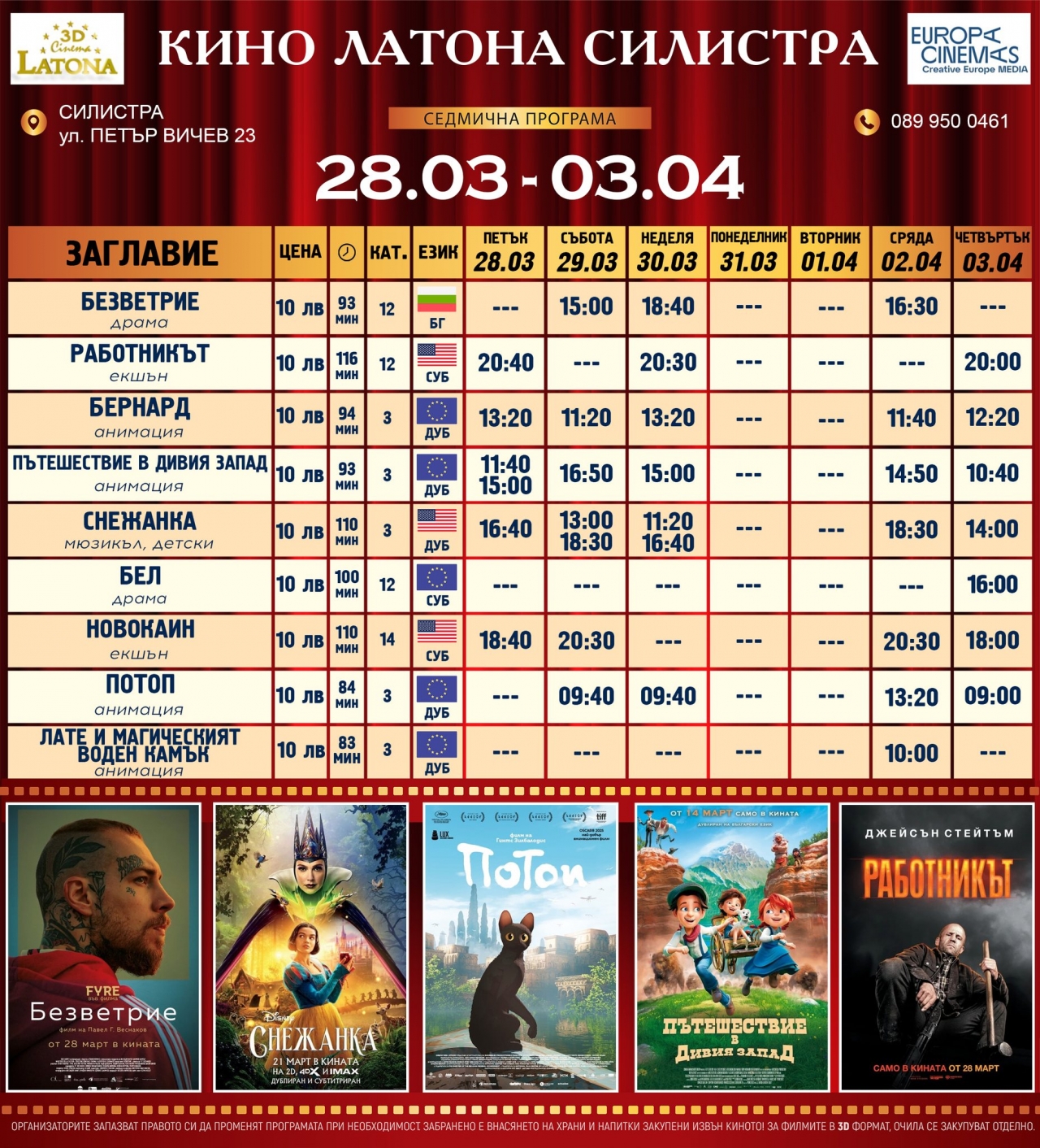 • "Потоп" – европейска анимация, която ще се прожектира всеки ден до 03.04, включително с две утринни прожекции (09:40 ч.).