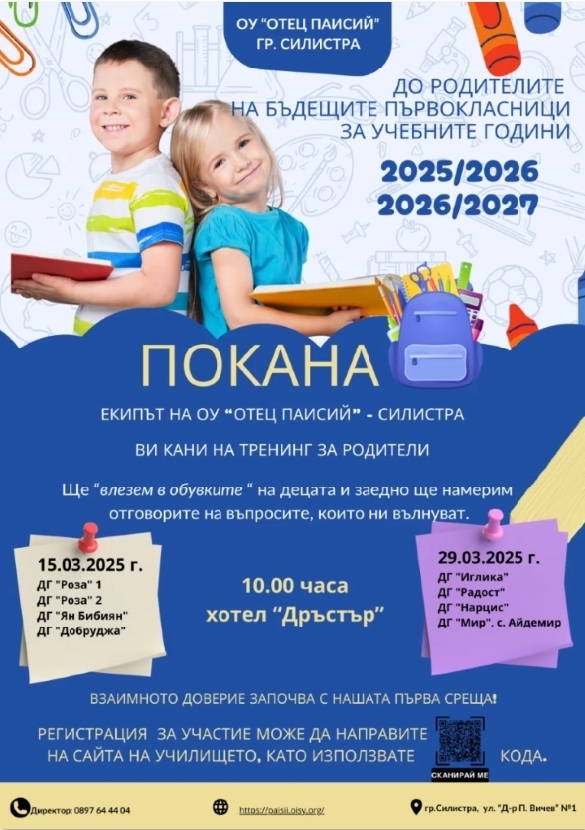 С наближаването на един от най-вълнуващите моменти в живота на всяко дете – първият учебен ден, ОУ "Отец Паисий" – град Силистра отправя специална покана към родителите на бъдещите първокласници за учебните години 2025/2026 и 2026/2027.