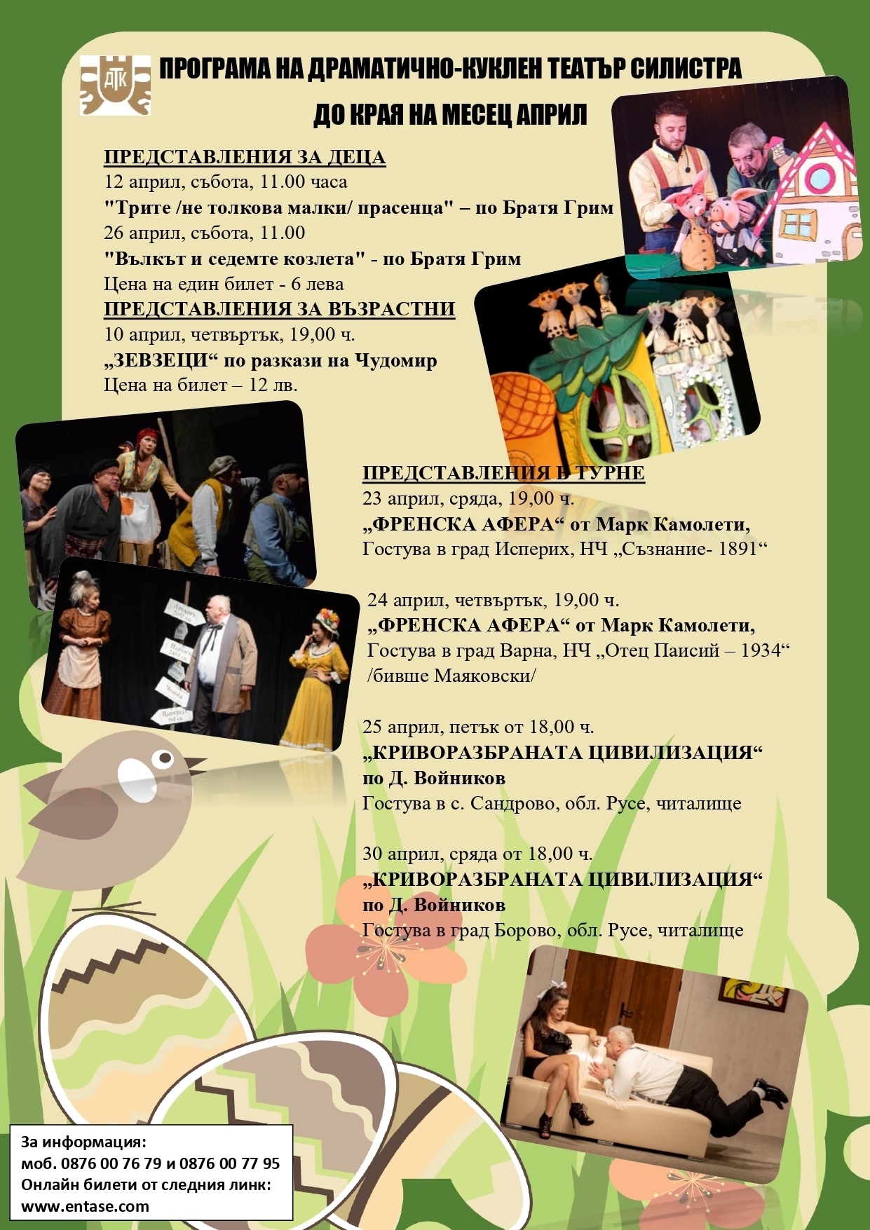 Драматично-куклен театър – Силистра подготвя богата театрална програма за любителите на сценичното изкуство в града и региона. До края на месец април зрителите ще имат възможност да се насладят на разнообразни спектакли за малки и големи, както и на вълнуващи гостувания в други градове.