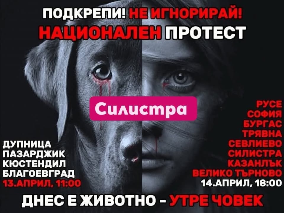 На 14 април 2025 г. (понеделник), от 18:00 ч., пред Съдебната палата в град Силистра ще се проведе протест в защита на животните. Инициативата е организирана в отговор на нарастващата обществена тревога относно случаите на жестокост към животни у нас, с фокус върху превенцията, справедливите наказания за извършителите и необходимостта от по-строга държавна политика за защита на животните.