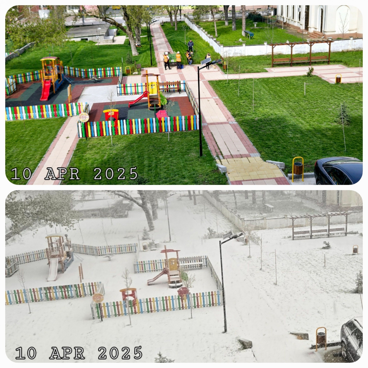 Необичайна метеорологична трансформация беляза 10 април 2025 година в град Главиница. Кметът на Община Главиница, г-н Неждет Джевдет, сподели в социалните мрежи два впечатляващи кадъра от охранителната камера, запечатали рязката промяна на времето в рамките на един-единствен ден.