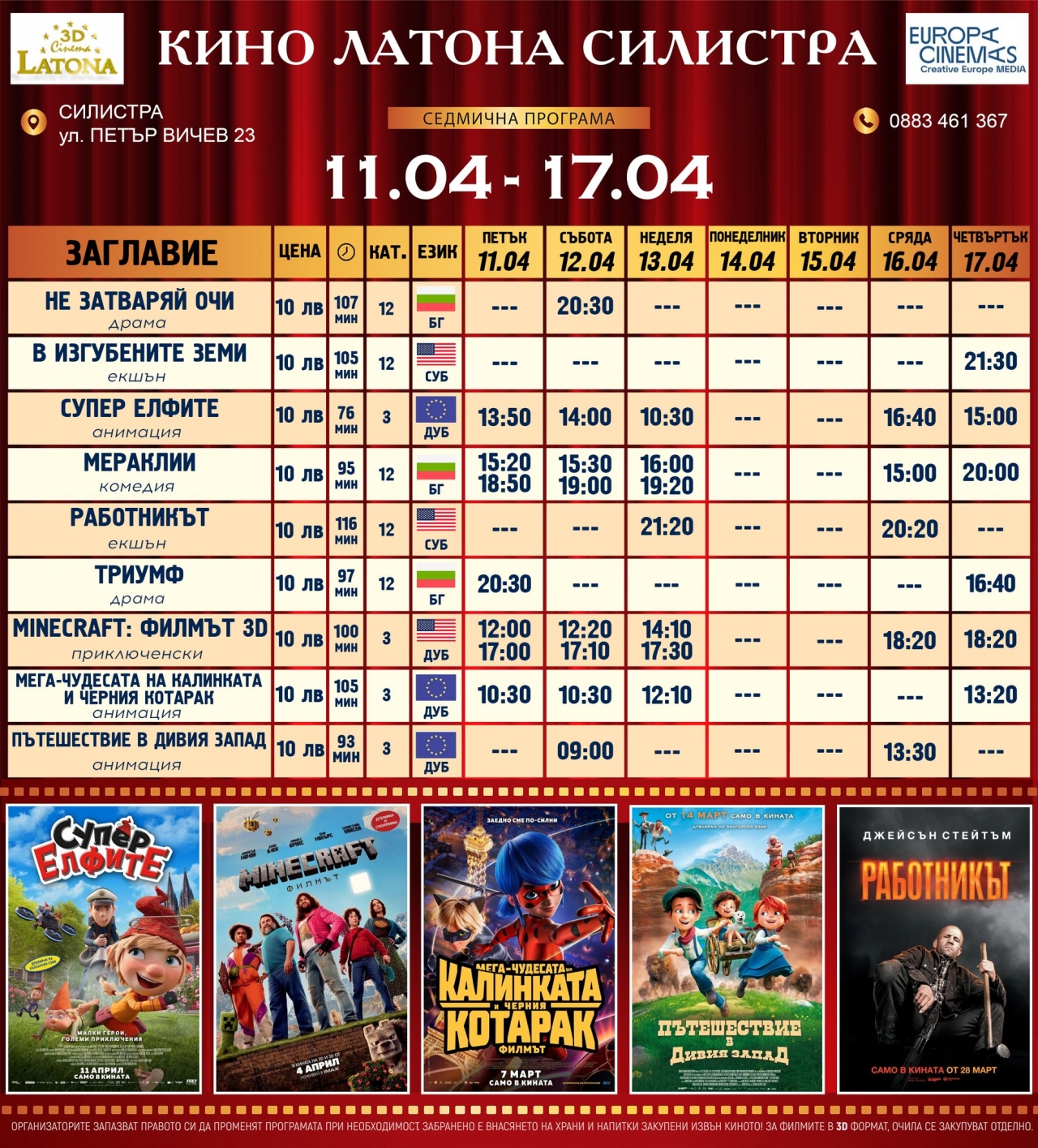 Кино "Латона" в Силистра обяви своята програма за периода от 11 до 17 април 2025 г., като зрителите могат да се насладят на разнообразен избор от филмови заглавия за всяка възраст и вкус.