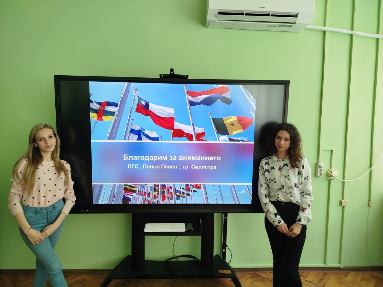 Младшите посланици на Европейския парламент от ПГС "Пеньо Пенев" – Силистра, Вероника Руменова и Стела Георгиева, впечатлиха с професионална презентация на тема "Знамената на Европа", представена пред студенти и преподаватели от Филиал Силистра на Русенския университет "Ангел Кънчев".