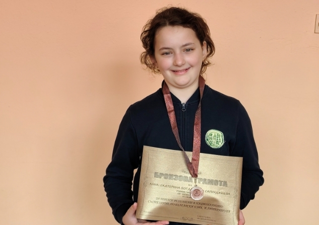 С особена гордост училището поздравява Анна - Екатерина Богдан - Йон Сапунджиева от III а клас, която завоюва бронзов медал на национално ниво. Нейният успех е плод на усърдие, талант и вдъхновяваща подкрепа от страна на учителите.