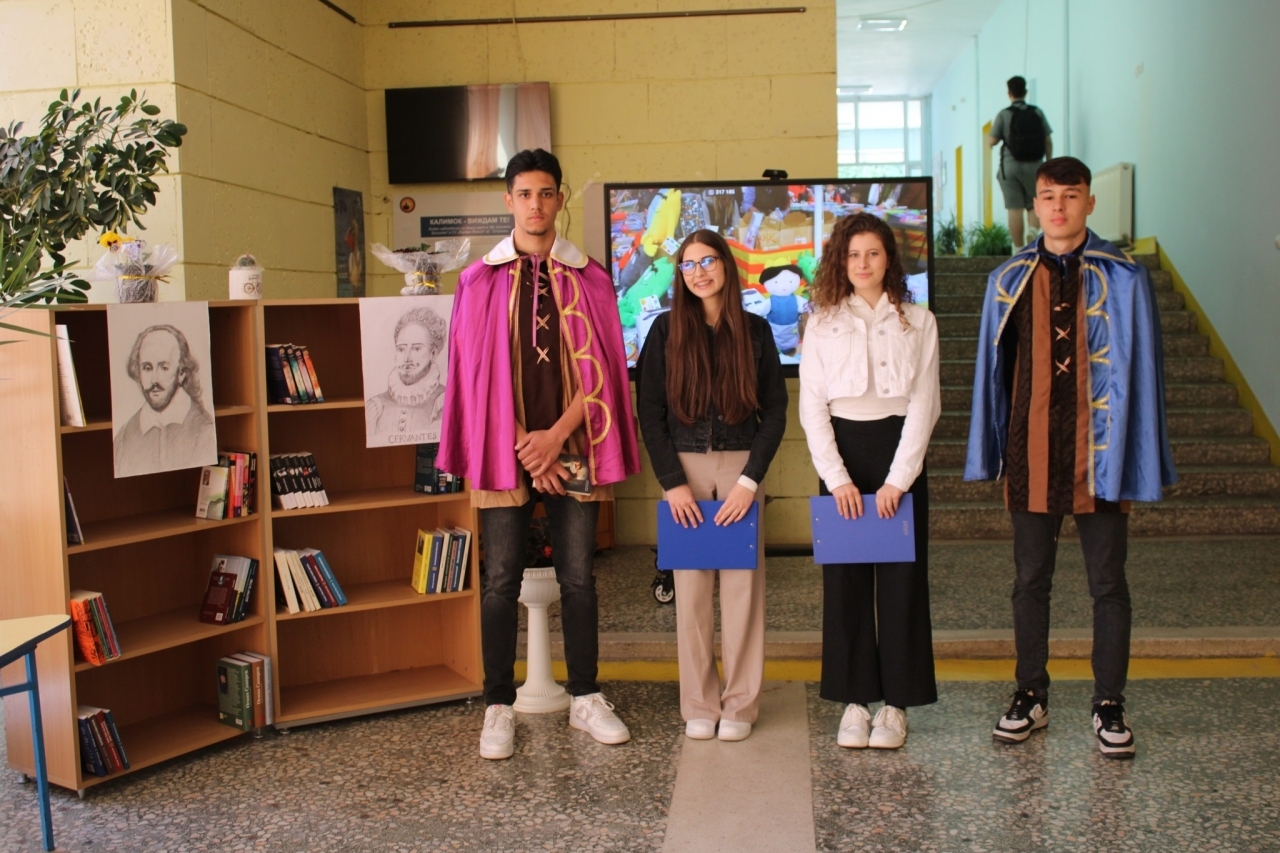 Учениците Ана-Мария Атанасова (10.б клас) и Никол Атанасова (8.б клас) представиха историята на празника, а последвалата интерактивна дейност за създаване на постери за Шекспир и Сервантес ангажира всички присъстващи.
