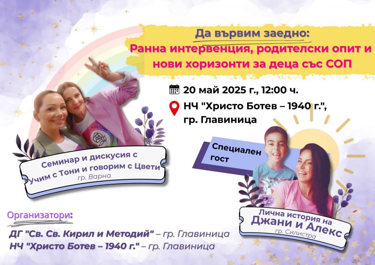 На 20 май 2025 г. от 12:00 ч. в сградата на Народно читалище "Христо Ботев – 1940 г." в гр. Главиница ще се проведе първото в общината събитие, посветено на темата за ранната интервенция и подкрепата за деца със специални образователни потребности. Инициативата е озаглавена "Да вървим заедно: ранна интервенция, родителски опит и нови хоризонти за децата със СОП" и се организира съвместно от Детска градина "Св. Св. Кирил и Методий" – гр. Главиница и Народно читалище "Христо Ботев – 1940 г.".